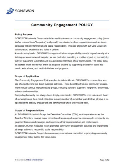 - Establish a sustainable procurement framework and uphold SONGWON’s Code of Conduct across the supply chain.